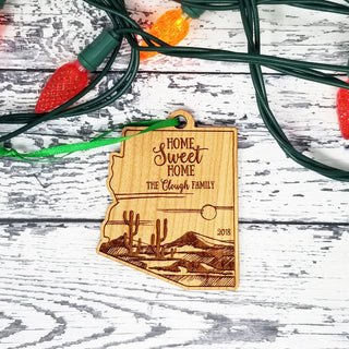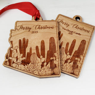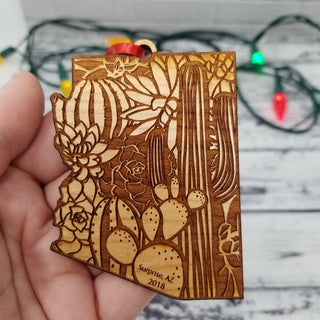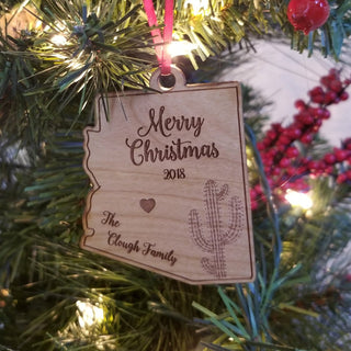 Arizona State shaped Christmas ornaments, personalized and unique gifts. Laser engraved and or sublimated in full color. Handmade in Surprise, Arizona.