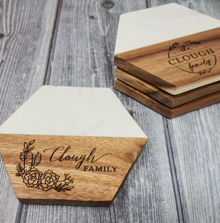 Personalized Coasters - Marble and Wood - Set of 4 - Monogram Cactus Floral Wedding Gift